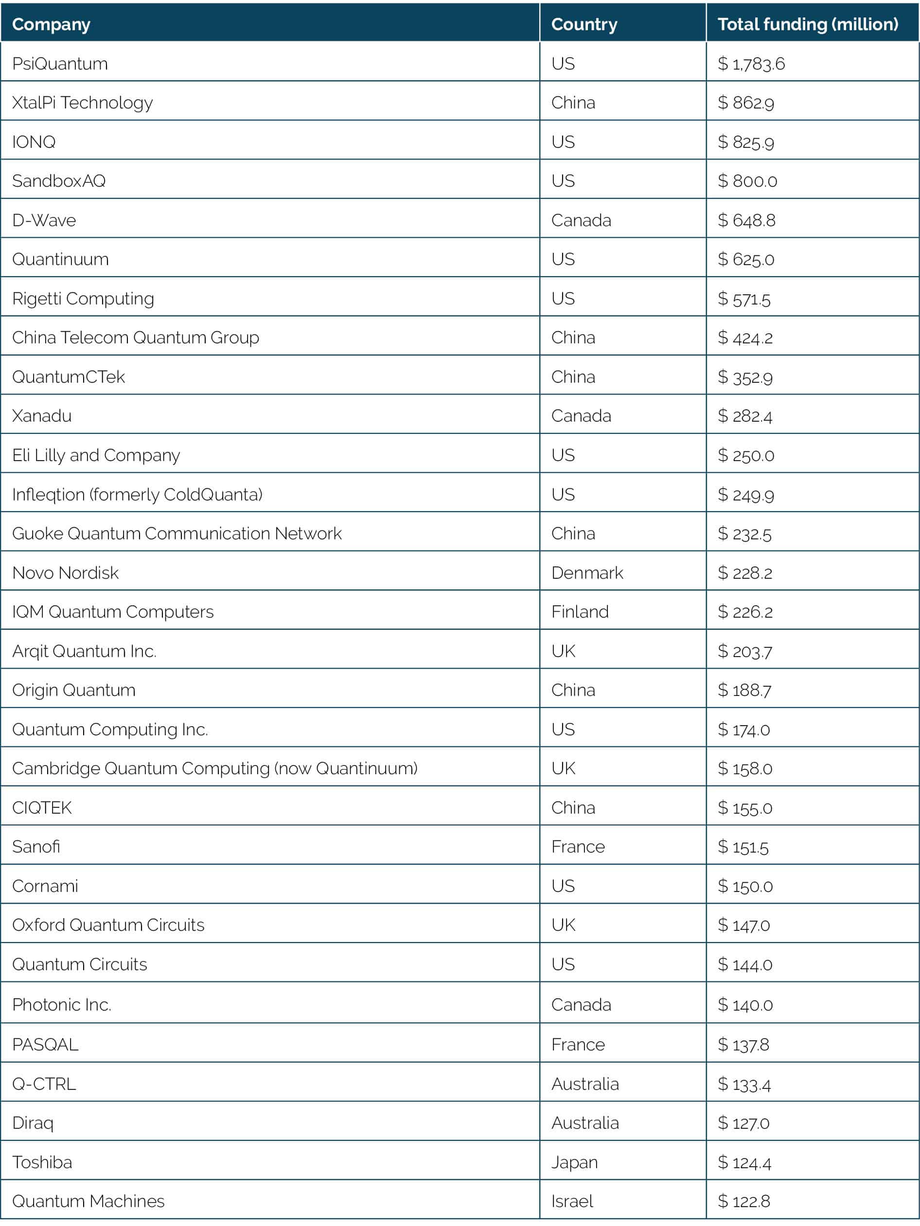 Table 1: Top 30 largest companies in the quantum sector by total disclosed funding, received or committed (as of 2024)