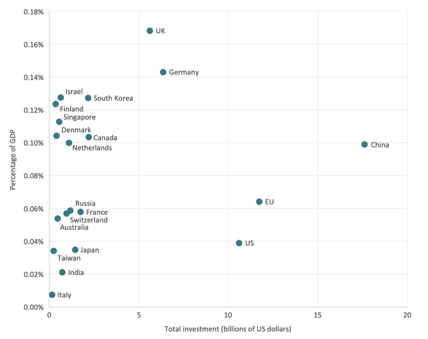 [11] The EU plot point represents the total investment in quantum technology by all EU Member States, divided by the bloc’s overall GDP. This is in addition to the individual plot points for each EU Member State, which represent the investments of specific countries.