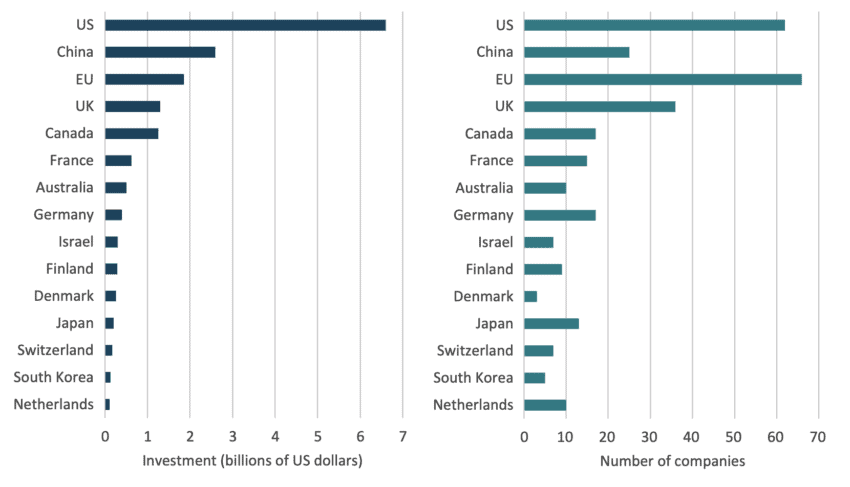 In contrast, the EU, despite boasting the largest number of companies – 66, or 26% of the total – makes up for just over 12% of the sector’s investments. Other English-speaking countries, including the UK, Canada, and Australia which have established themselves as significant global players, have a better balance. Driven by the strength of their private sectors in the quantum technology space, their 63 companies represent 24% of the global landscape and over 20% of the total funding.