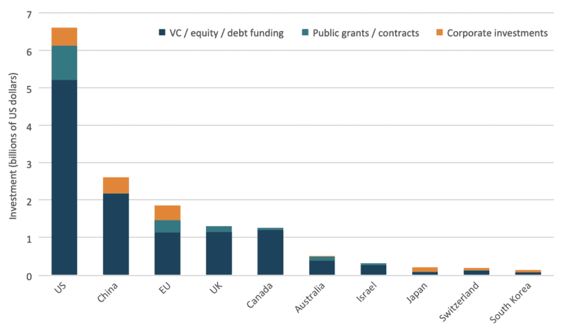Figure 4: Total investment in quantum companies by source of funding for selected countries and regions (billions of US dollars)