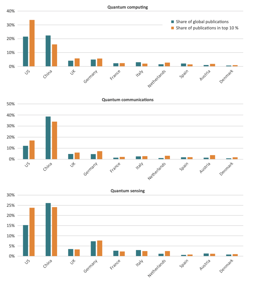 Chapter 4 provides an academic publication analysis. The paper draws on data for quantum publications between 2019 and 2023 from the Australian Strategic Policy Institute (ASPI)’s Critical Technology Tracker. The analysis identifies which countries – among the US, China, and EU Member States – are producing the largest volume and highest quality of quantum research.
