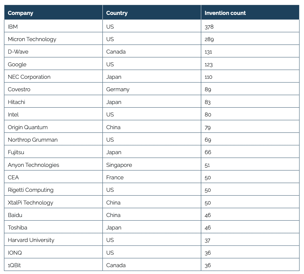 Table 2: Top 20 quantum technology applicants (fractional count of international patent families), 2010–2023