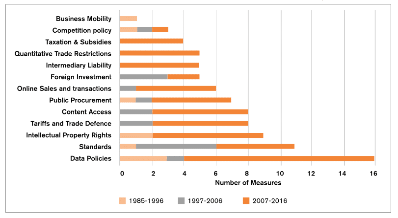 Figure 1: Number of measures restricting ICT and digital trade in China, 1985-2016