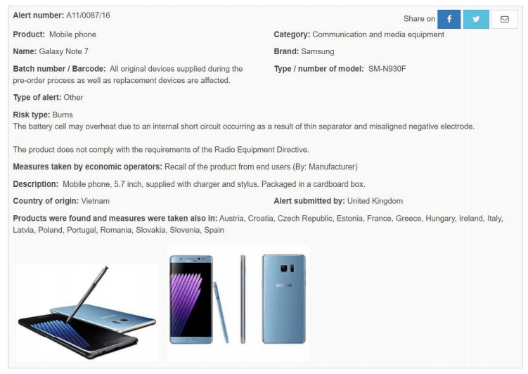 Alert notification for the Samsung Galaxy Note 7, September 23 (RAPEX 2016)