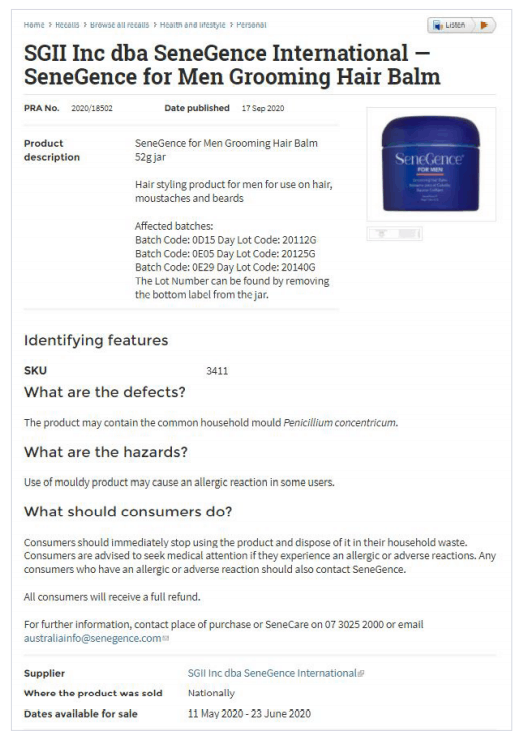Australian Competition and Consumer Commission – ACCC (2020b). SGII Inc dba SeneGence International — SeneGence for Men Grooming Hair Balm, 2020/18502, Product Safety Australia, September 17. Available at: https://www.productsafety.gov.au/recall/sgii-inc-dba-senegence-international-senegence-for-men-grooming-hair-balm