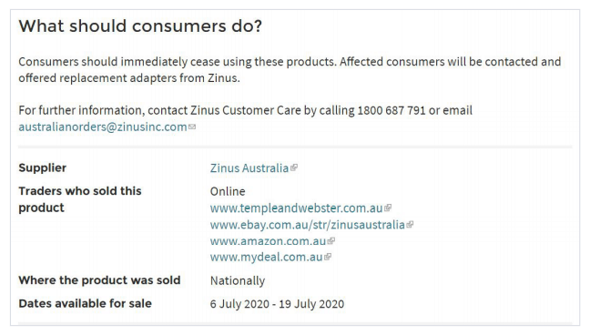 Australian Competition and Consumer Commission – ACCC (2020c). Zinus Australia — USB Charger Adapter for Zinus Suzanne Bed, 2020/18461, Product Safety Australia, September 23. Available at: https://www.productsafety.gov.au/recall/zinus-australia-usb-charger-adapter-for-zinus-suzanne-bed