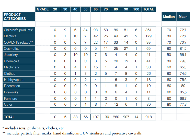 A few product categories account for most safety issues. In the Commission’s most recent Safety Gate annual report looking at results from 2020, 27% of unsafe concerned toys, 21% motor vehicles, 10% electrical appliances and 9% COVID-19 related (European Commission 2021c).