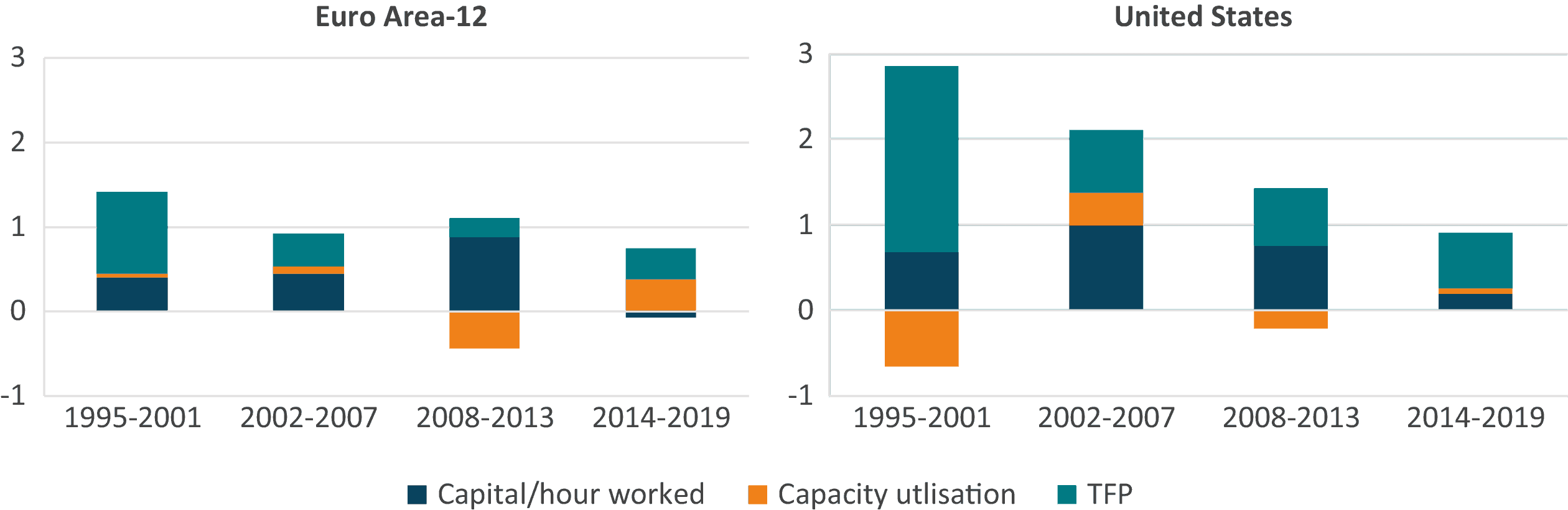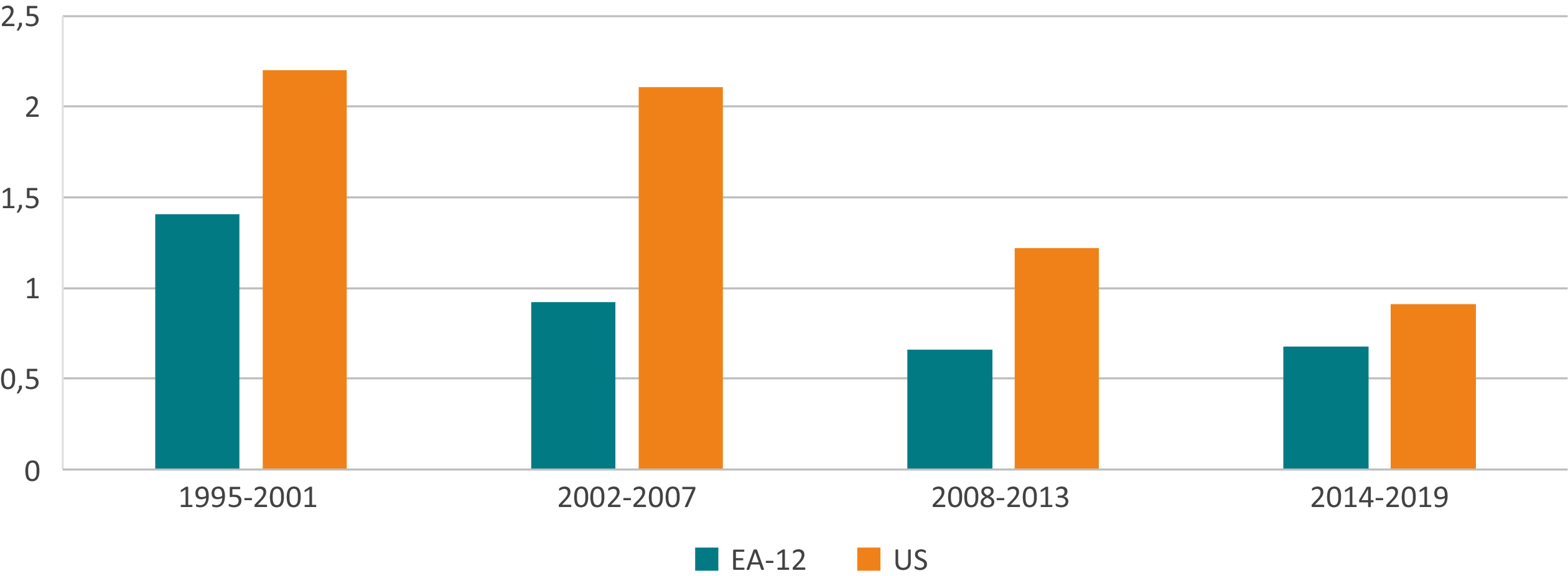 In the US, the relative shares of factors driving economic growth are somewhat similar, but what stands out is that the contribution of capital deepening and TFP growth is substantially bigger than in the Euro Area. While the US TFP rate has declined from the high levels in the 1990s – levels that were pushed by technological change through the information and communication technology (ICT) revolution after a sharp increase in ICT capital expenditure – TFP growth remains much higher than in the Euro Area group.
