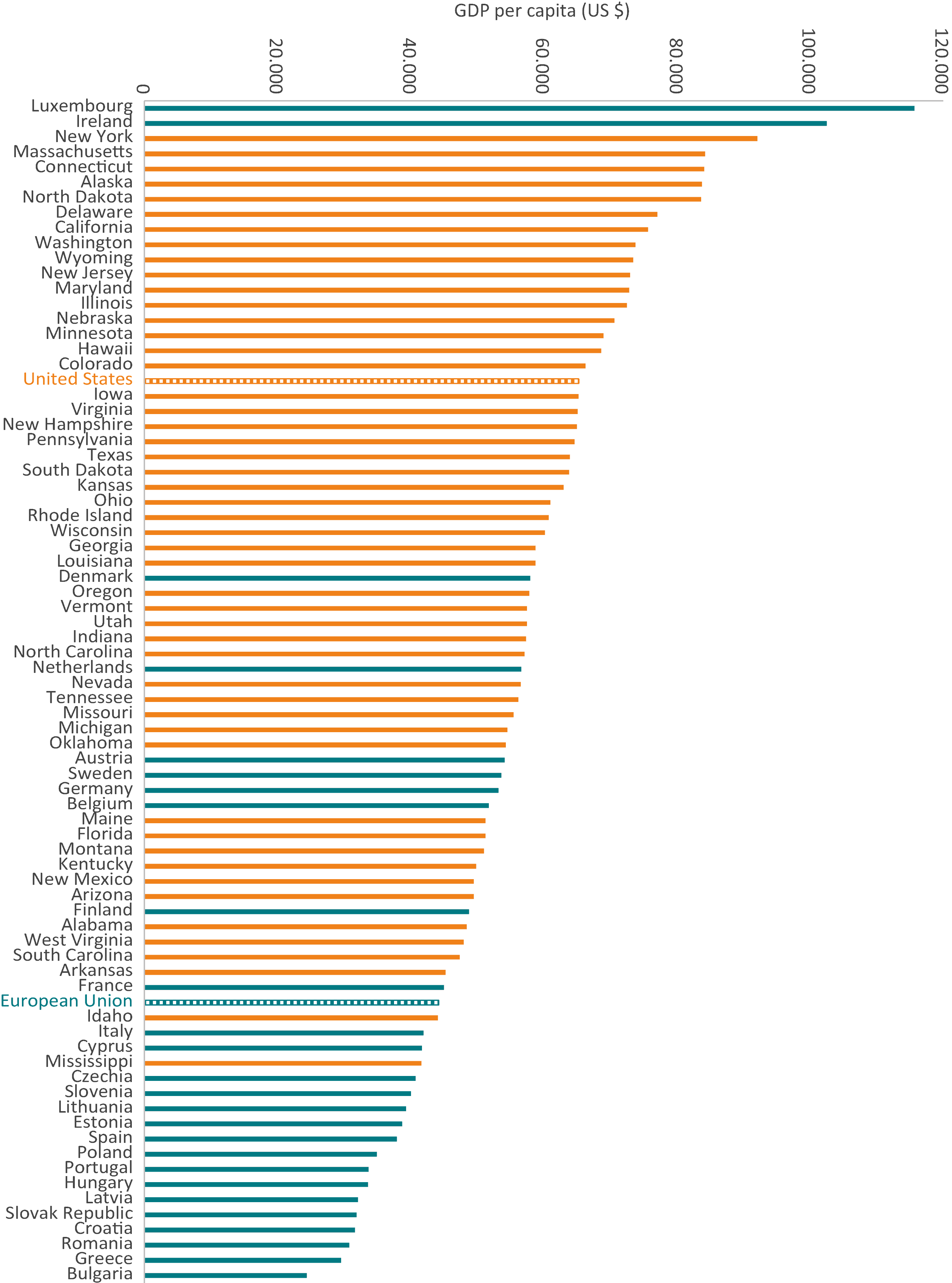 Figure 3 presents US states and European member states GDP per capita in US dollar, from the highest to the lowest. The figure clearly shows that US states are far more represented in the upper part of the ranking than the EU member states. This translates into EU and US average that differ considerably, with the US average sitting in the 19th position and the EU average at a mere 60th place. At the bottom of the table are Central, Eastern and Baltic EU member states which started the 2000s with a relatively low income per person and southern EU member states like Greece, Portugal, Spain, and Italy.[8]