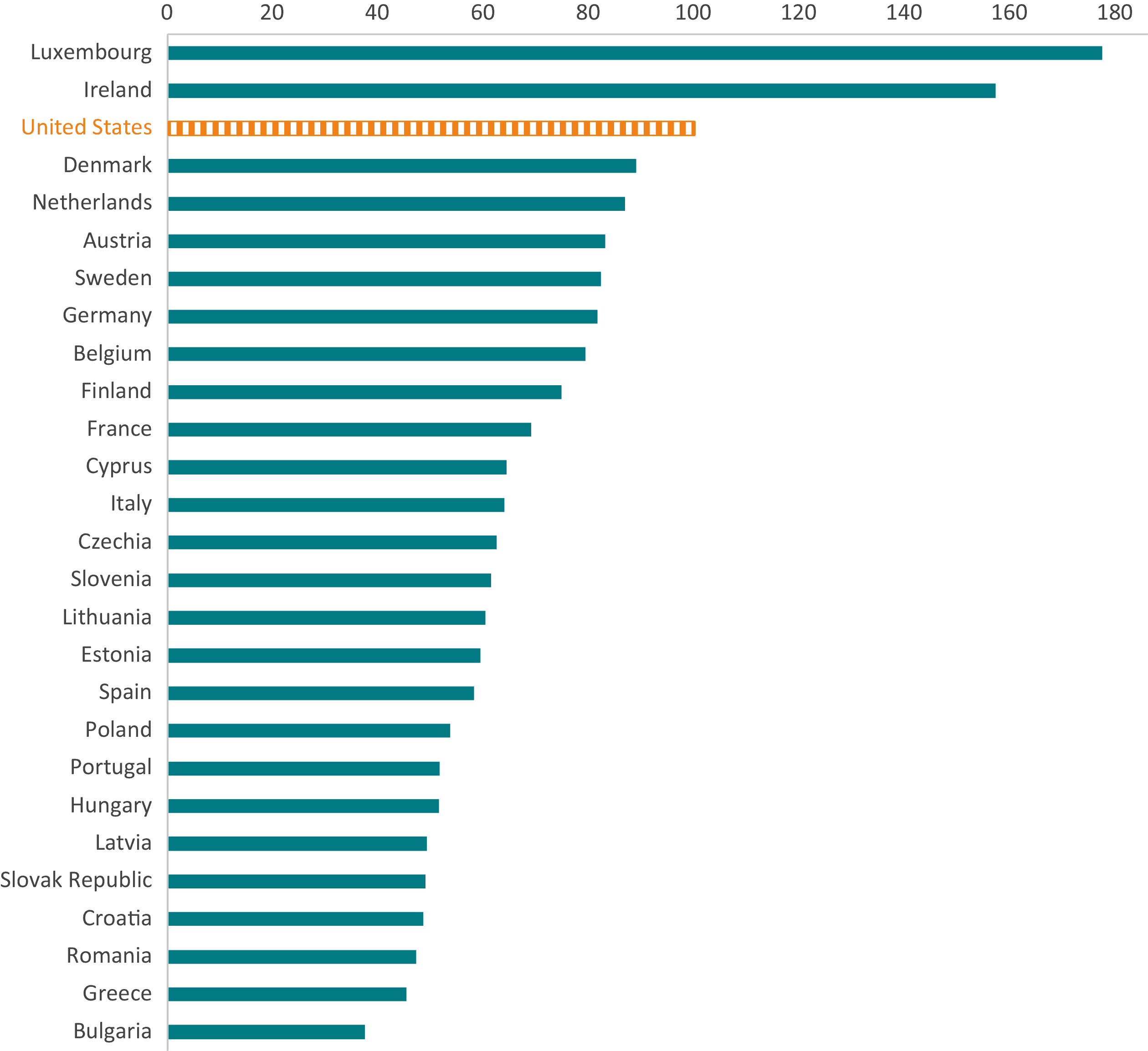 FIGURE 4: RANKING OF EU MEMBER STATES RELATIVE TO THE US (US equal to 100, 2021)