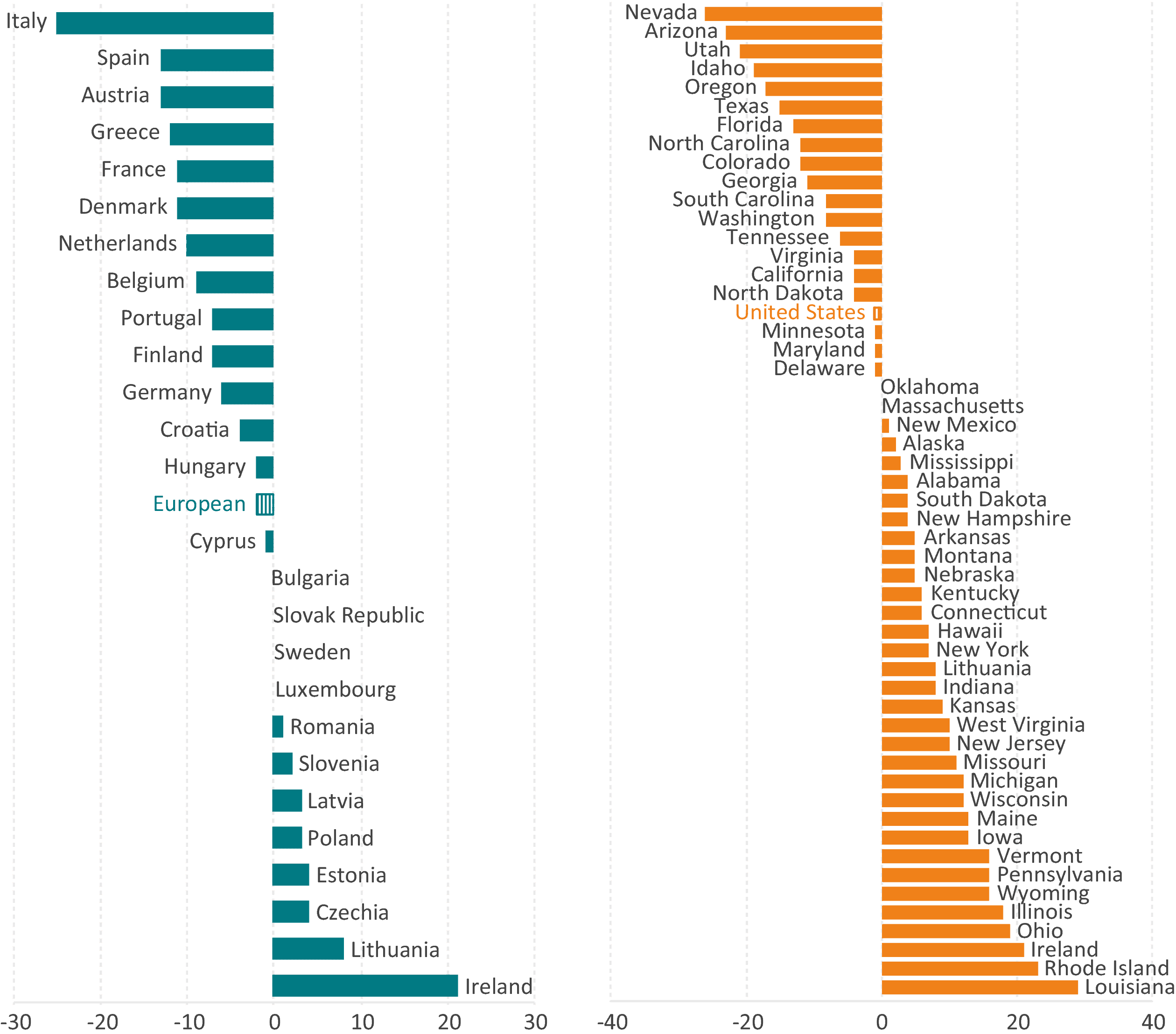 While the comparison between EU member states and US states GDP per capita is striking, the evolution over the last twenty years is staggering. Figure 5 shows the change in the ranking of each EU member state and US state between 2000 and 2021. A positive value means that a EU member state or US state has climbed up in the ranking while a negative value means that its ranking was higher in the year 2000 than in 2021.