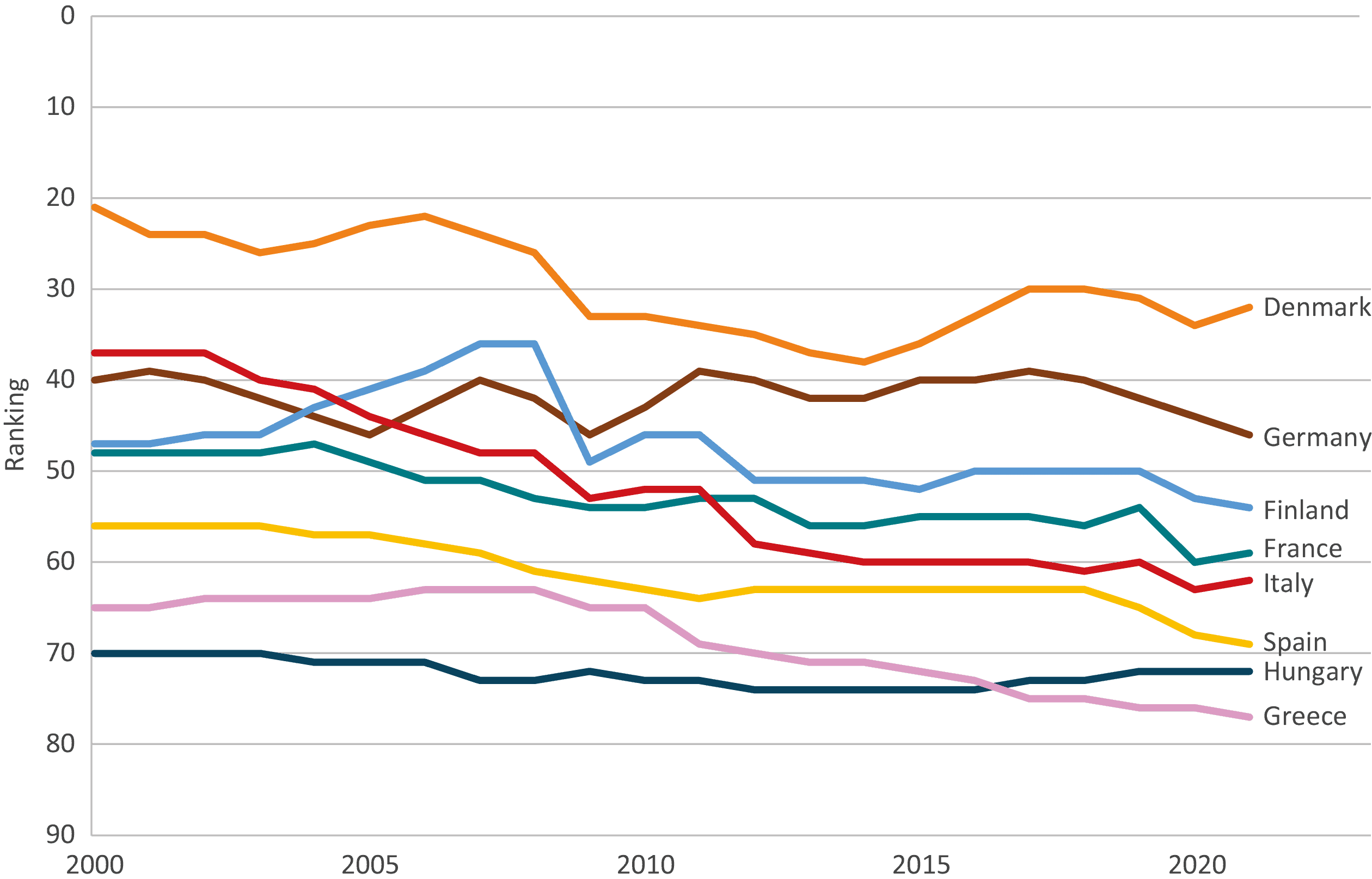 Figure 6 complements the previous one by presenting 8 of the 14 EU member states which have been falling in the ranking of GDP per capita. The figure shows that not all countries have experienced the same pattern of decline. Some, like Italy that lost 25 places, but also France, Spain, and Greece have seen a steady fall in the ranking. Others, like Finland, illustrate a story of mixed successes: a steady growth until 2008, when the financial crisis brought the country 13 positions down, effectively wiping out all previous gains in the space of a year. The figure also illustrates the effects of the pandemic in 2019, with countries like France and Italy hit relatively harder than the rest.