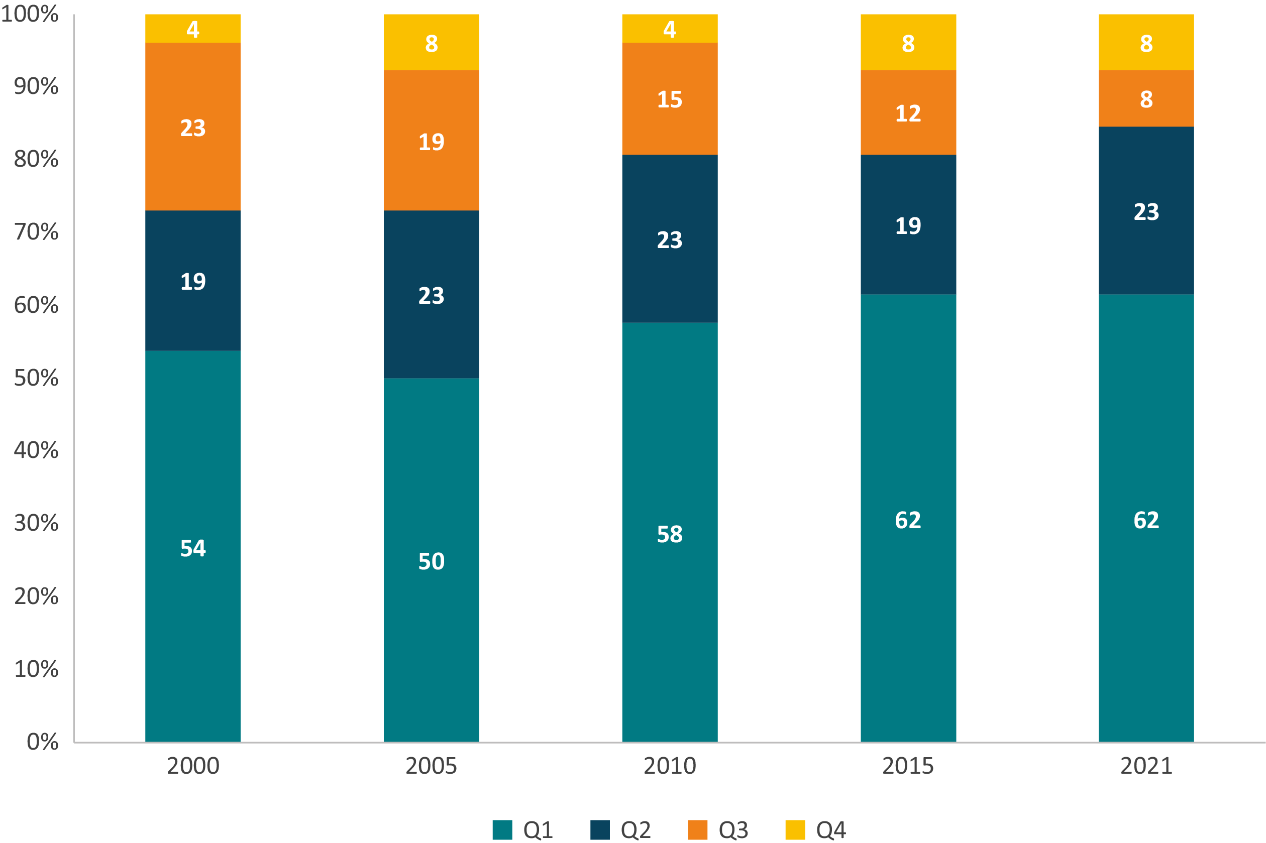 Another way to illustrate the relative fall of EU member states is to display the number of EU member states in the shared distribution of GDP per capita over time. In other words, if we rank the US and EU economies from the highest to the lowest GDP per capita, how many member states in Europe would be in the bottom part of the distribution? Figure 7 answers that question and shows that the proportion of EU member states that fall below the median, which is the sum of the first and second quartile, went up. In 2000, 73 percent of EU member states were in the bottom half of the combined distribution of EU member states and US states GDP per capita, and in 2021 this figure was 85 percent. At the same time, the proportion of EU member states above the middle of the distribution, represented by the sum of the third and fourth quartiles, went down. In 2000, 27 percent of EU member states were in the top half of the combined distribution, but in 2021 only 16 percent, i.e., Luxembourg, Ireland, Denmark and the Netherlands, belong to either of the two top quartiles.