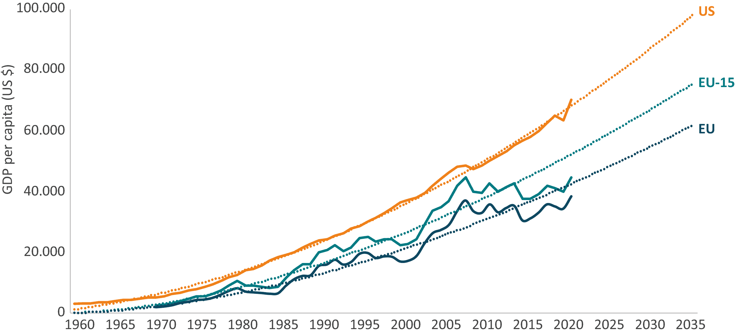 EU and US GDP per capita behaved similarly until 2000 when the gap between both lines started to widen visibly. The path of divergence continued and became particularly acute from 2010 onwards when US GDP per capita grew at an average of 3.4 percent while EU GDP per capita increased by 1.6 percent on average. Such a sustained difference matters a lot: in 2010 US GDP per capita was 47 percent larger than the EU while in 2021 this gap increased to 82 percent. If the current trend of GDP per capita carries forward, in 2035, the average GDP per capita in the US will be $96,000 while the average EU GDP per capita will be $60,000. This is the same difference in GDP per capita as between Japan and Ecuador today. And even though the difference in levels between the US and the EU-15 is smaller, the trend and the widening gap are very similar.