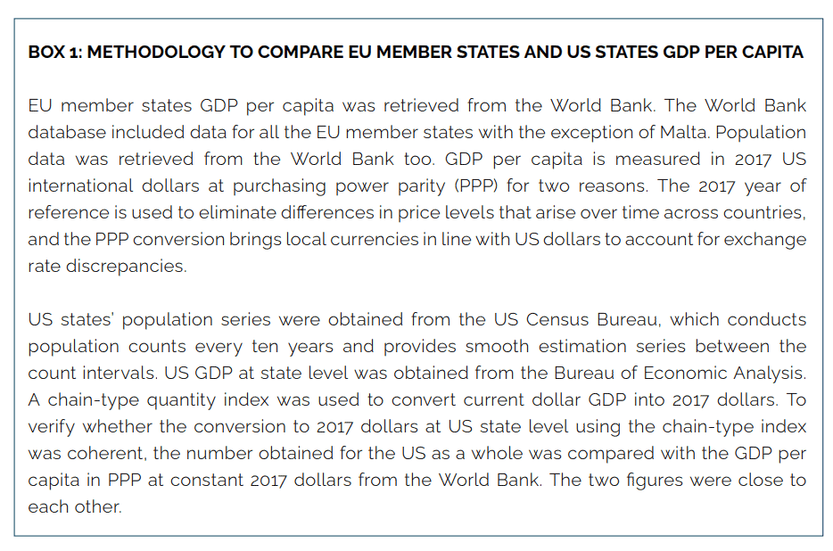 As mentioned before, GDP per capita is not the end-all-be-all of economic policy and there are many aspects that are critical for a good life in which the EU outperforms the US. However, it is also certain that the ability of a country to face the environmental, demographic, and geopolitical challenges of the coming decades will improve with higher levels of economic growth. The comparison with US states shows that developed economies, like EU member states, are able to sustain robust growth rates of GDP per capita.