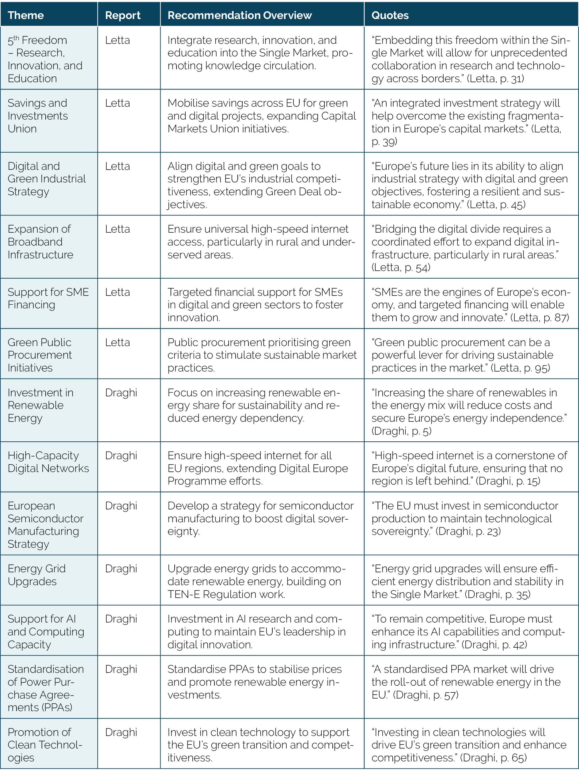 Table 2: Key policy recommendations from the Letta and Draghi Reports to improve EU Competitiveness
