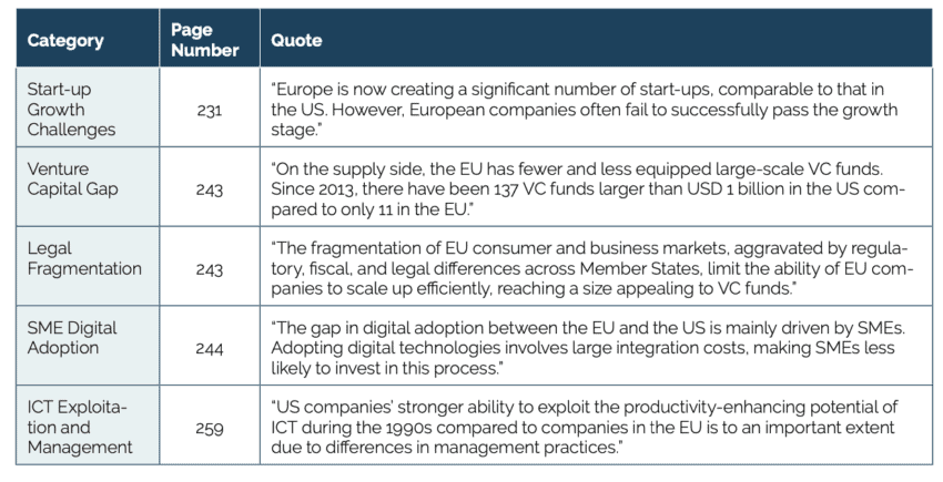 Table 1: Legal fragmentation and Europe’s business scaling problem, key insights from the Draghi Report[1]