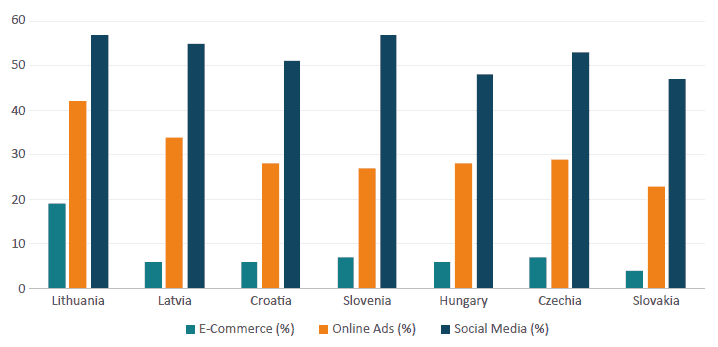 Before turning to the detailed survey evidence that captures how consumers interact with the DMA, it is useful to situate the discussion more broadly and highlight that the regulation also directly affects businesses. As shown in Figure 1, business use of digital platforms in Central and Eastern Europe varies across countries and across platform types. In Lithuania, for example, 19 per cent of firms derive at least 10 per cent of their online sales from e-commerce marketplaces, whereas in Slovakia the figure is only 4 per cent. Online advertising penetration ranges from 23 per cent in Slovakia to 42 per cent in Lithuania. By contrast, the use of social media for business purposes is consistently the most widespread, with between 47 per cent (Slovakia) and 57 per cent (Lithuania, Slovenia) of companies engaging on these platforms.