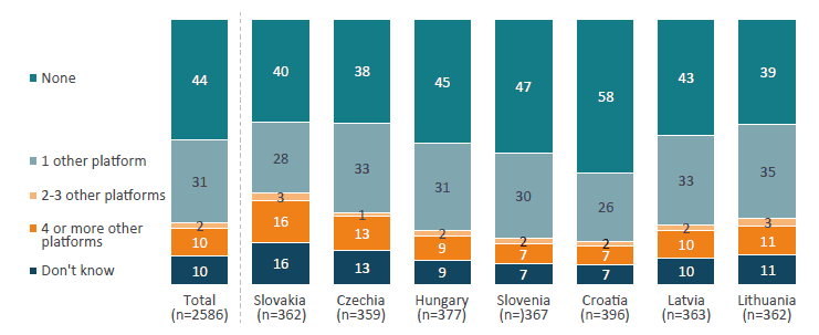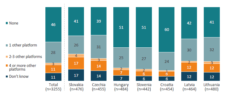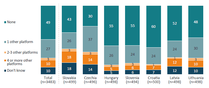 Usage patterns show that major platforms still dominate daily life according to the Ipsos survey. An astonishing 70 per cent of individuals use Google Search multiple times a day (Figure 12) and over 75 per cent use Facebook daily (Figure 13). These figures underscore strong incumbency advantages – users are accustomed to and dependent on the services of designated gatekeepers. If the DMA were truly making markets contestable, we might expect a decline in single-platform dominance or at least an uptick in consumers engaging with multiple providers. But the opposite appears true: a large share of users do not utilise any alternatives. Approximately half of CEE users use no alternative to Google’s services at all (only Google for search, maps, etc.) (Figure 14), and nearly 40–50 per cent use no alternative to Facebook (Figure 15) or Instagram (Figure 16) as social media platforms. For professional networking, the monopoly is even starker – over 60 per cent of people have no alternative to LinkedIn in use (Figure 17). In summary, many consumers are “single-homing” on the very gatekeeper services the DMA targets, and this behaviour has not markedly changed in the post-DMA environment.