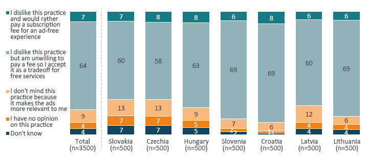 The Ipsos survey found that while people dislike data-driven ads in principle, an overwhelming majority are unwilling to pay for an ad-free, privacy-enhanced service. Depending on the country, 60–69 per cent of users admit they accept pervasive data collection in exchange for “free” services (Figure 8) rather than pay a subscription fee for more privacy. Only a tiny minority (single-digit percentages) would actually pay to avoid personalised ads. This means that the DMA-mandated option to opt out of tracking (e.g. Meta’s new paid plan) has scant uptake – most consumers stick with the status quo. In practice, the average user’s privacy situation has not dramatically improved: they continue to be tracked and shown targeted ads as before, because opting into the new “more private” alternative is either costly or cumbersome. The Commission’s vision of masses of consumers enjoying tracker-free social media thus hasn’t materialised; instead, we see a begrudging tolerance of old data practices in order to keep services free.