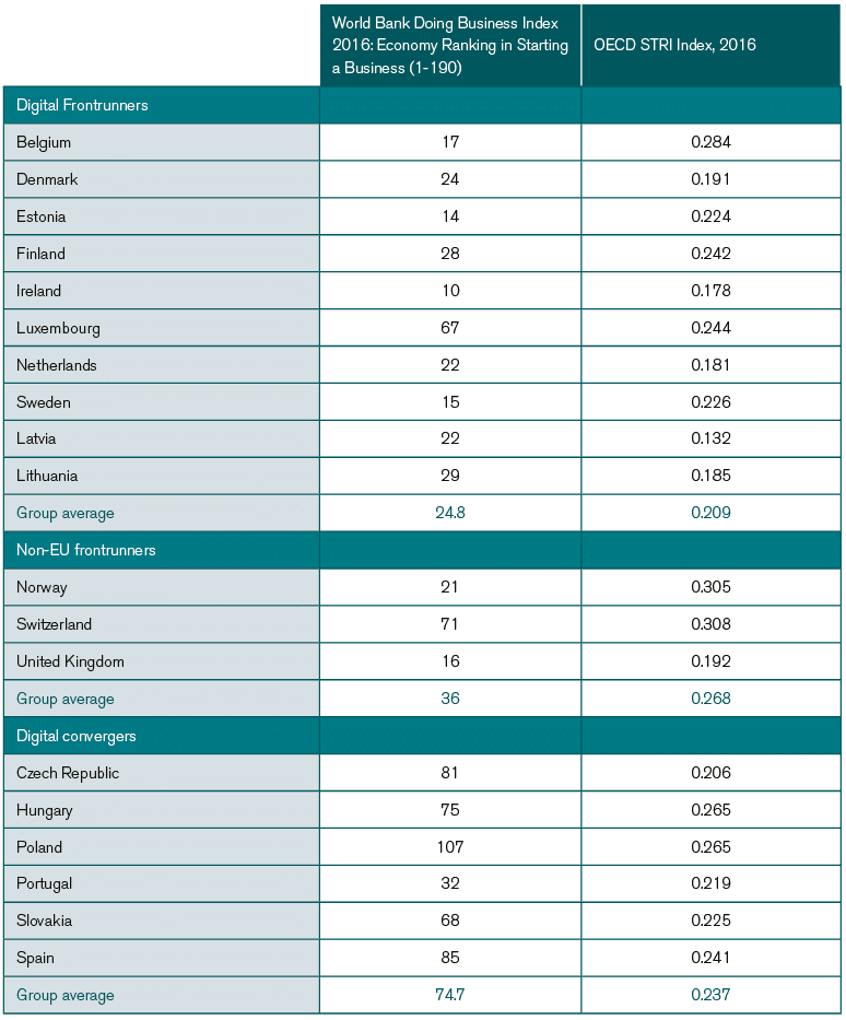 Reduced product market regulations in these sectors are an important factor for attracting investment and increasing economic growth. According to the World Bank’s Doing Business database, digital convergers could still improve their position in this area. Their average position in the ranking from 1 – 190 is only 74.7, which is behind the average of the digital frontrunners with a score of 24.8 and of the non-EU frontrunners with a score of 36. Also, note again that Lithuania and especially Latvia have rankings that are fully in line with the digital frontrunner average, again confirming that they can be considered to be part of this group (see the table below).