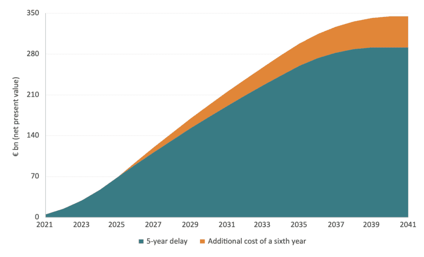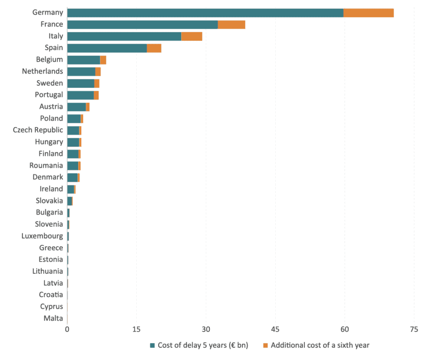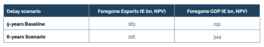 To put these figures in perspective: for France and Italy, the six-year delay represents forgone exports equivalent to roughly one and 1.6 years of economic growth, respectively, in 2023 and 2024.[10] For Germany, where the economy contracted in both 2023 and 2024, the €71bn shortfall amounts to 1.7 per cent of GDP, incurred during a period when growth was negative.