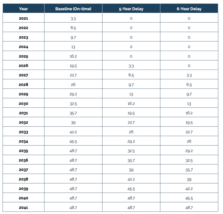To illustrate how these cumulative costs build up, Table 2 shows the annual export gains under each scenario. In any given year, the difference between the baseline and a delay scenario represents that year’s foregone benefit. These annual gaps accumulate over time to produce the cumulative shortfalls shown in Figures 1 and 2. Once all scenarios reach full implementation (by 2041 for the 6-year delay), no new losses accrue, but the cumulative losses incurred during the delay period are permanent.