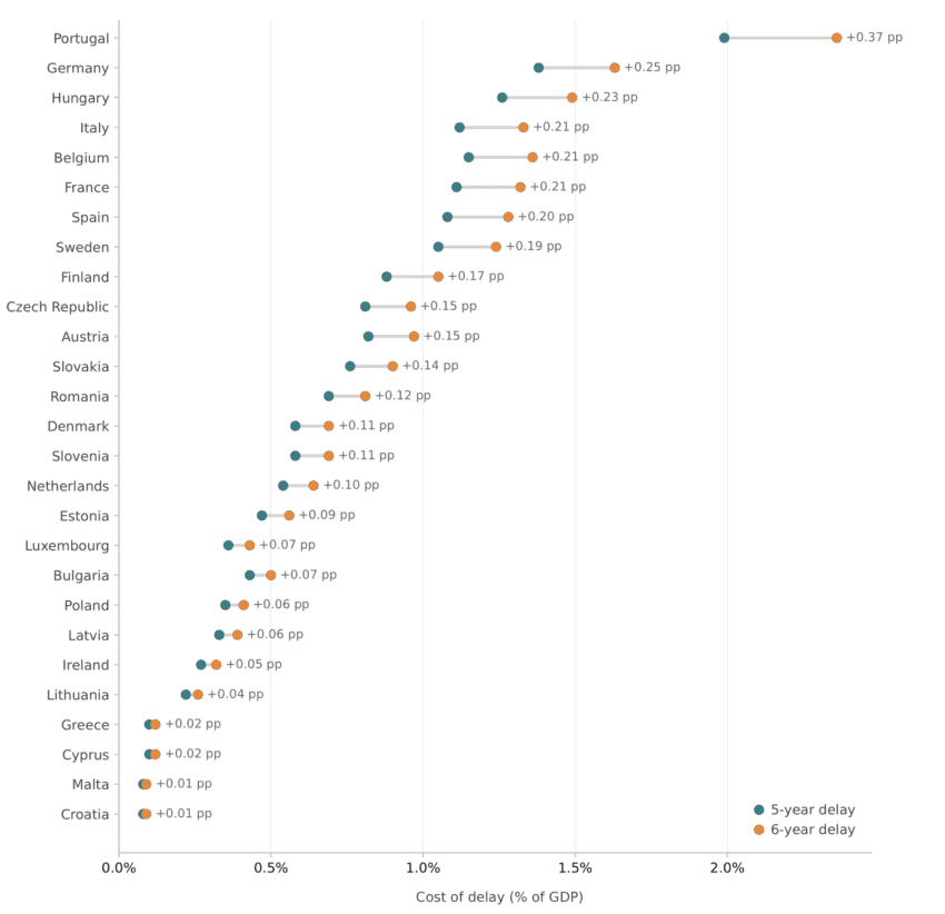 - The estimated €291bn GDP loss from a five-year delay represents around 1.6 per cent of EU GDP (2024: ~€17.9tn), equivalent to roughly two years of EU economic growth at the 2023-24 average pace (0.4 per cent in 2023; 1.1 per cent in 2024).[4] For an economy struggling to find growth momentum, this represents a substantial missed opportunity.