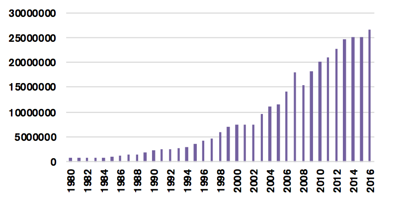 Diagram 2 beskriver utvecklingen av det globala beståndet av utländska direktinvesteringar mellan 1980 och 2016.[1] Tillväxten i FDI har varit ännu starkare än för handel. Under den perioden växte det globala beståndet av FDI från 0,7 till 25 biljoner dollar.