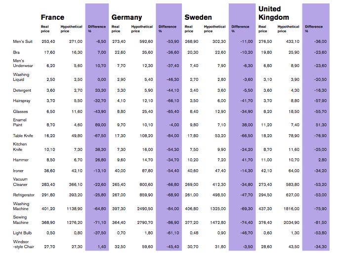 Svaret på tankeexperimentet finns i Tabell 1 – och, i brist på bättre metoder, fungerar det som en illustration på hur mycket globalisering har sänkt priset på typiska hushållsprodukter. Vi har beräknat ett hypotetiskt pris för de varor som listas i tabellen – och i princip är det hypotetiska priset det vi i dag skulle hav fått betala om varans prisutveckling hade följt den allmänna konsumentprisutvecklingen i ett land mellan 1970 och 2005. Detta hypotetiska pris jämförs sedan med det faktiska eller observerade priset för samma vara. Som det framgår av kolumnen som beskriver skillnaden i procent mellan det faktiska priset 2005 och det hypotetiska priset, är det en stor skillnad mellan dem. Det hypotetiska priset är i de flesta fall väsentligt högre än det reala priset, och skillnaden är anmärkningsvärt stor i produkter som kylskåp, tvättmaskiner och symaskiner. Det här är produkter som ofta beskrivs som kapitalvaror för hushåll, och en orsak till det är att ett hushåll ofta behövde låna kapital för att ha råd med dem för fyrtio år sedan. För de flesta hushåll i västeuropeiska ekonomier idag är det inte nödvändigt att låna pengar för att köpa en dammsugare – men det var verkligheten för många hushåll 1970.