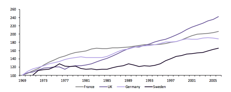 Diagram 4 visar utvecklingen av reallönen i tillverkningssektorn i fyra länder i Europa (Frankrike, Tyskland, Sverige och Förenade kungariket) mellan 1970 och 2007, då den globala finanskrisen startade. I detta diagram har nominella löner justerats med det allmänna konsumentprisindexet (KPI) för varje land och visar därmed lönetillväxten utöver den årliga prisökningen på en viss korg med vanliga konsumentvaror och tjänster. Det finns skillnader mellan länderna, men de har alla haft perioder med svag reallönetillväxt på grund av inflationen. Medan den brittiska och franska arbetaren såg sin reella timinkomst mer än dubblas under perioden, började den svenska arbetstagaren få det bättre från mitten av 1990-talet – efter två decennier av hög inflation och makroekonomiska problem. Faktum är att den svenska arbetaren inte upplevde någon ökning av sin reallön mellan mitten av 1970-talet och mitten av 1990-talet. I Frankrike var det en påtaglig tillväxt mellan slutet av 1960-talet och början av 1980-talet, men sedan sjönk tillväxten i reallöner – också på grund av inflation. Sedan den senare delen av 1990-talet har reallönerna accelererat igen. Tyskland, en hök i inflationsfrågor, har upplevt en relativt konstant tillväxt. I mitten av 1980-talet var tillväxten högre än under 1990-talet och de senaste åren (Tysklands reallöner under 1990- och 2000-talet påverkades mycket kraftigt av återföreningen mellan Väst- och Östtyskland). Storbritannien har haft en snabb tillväxt sedan början av 1980-talet och är de land som haft mest tillväxt i reallönerna.