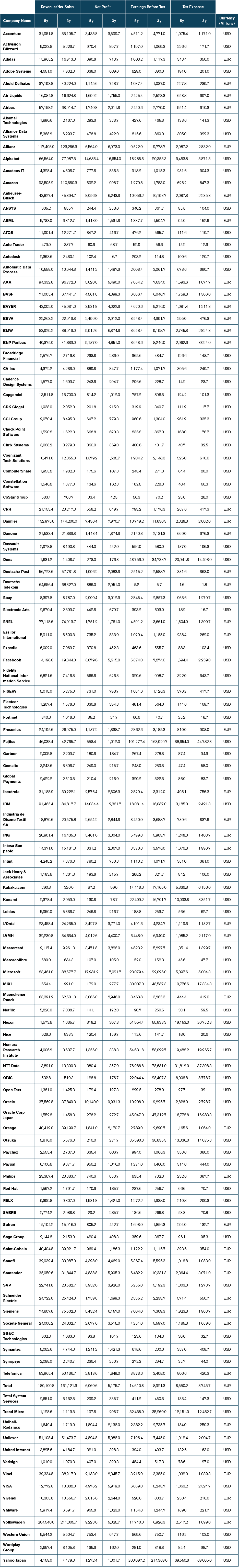 - Traditional, less digital or non-digital corporations: EuroStoxx50 corporations: 49 corporations (EuroStoxx50 ex SAP) of which 3 companies were non-profitable for the periods under study (5y and 3y)[1]