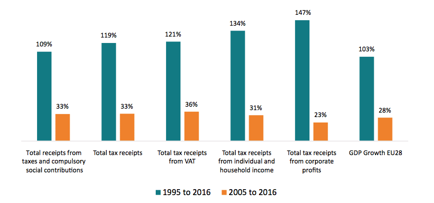 Figure 1: EU growth rates of government tax receipts, 1995 to 2016 and 2005 to 2016