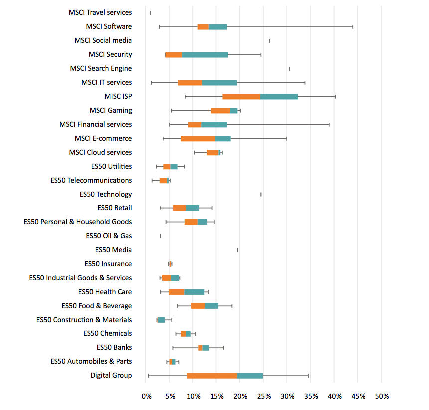 Note: own calculations based on annual reports and financial statements, supplemented by data collected by the Financial Times’ database. MSCI = MSCI Digital Services. ES50 = EuroStoxx50. The box-plot represents maximum value, 75 percent quartile, median, 25 percent quartile and minimum value. Real industry data do not include loss-making companies: when a company has more than three years of losses in the 5-year period, it has been dropped from the analysis in order to avoid distorted figures. “EuroStoxx50” companies do not include Deutsche Bank, E.ON, ENGIE, ENI, and Nokia. “Digital Group” companies do not include Twitter and Salesforce. “MSCI Digital services companies” do not include Autodesk, Dell, Zillow, Shopify, Splunk Workday, ServiceNow, Symantec, Nuance Communications, Nintendo, DXC Technology, and First Data.