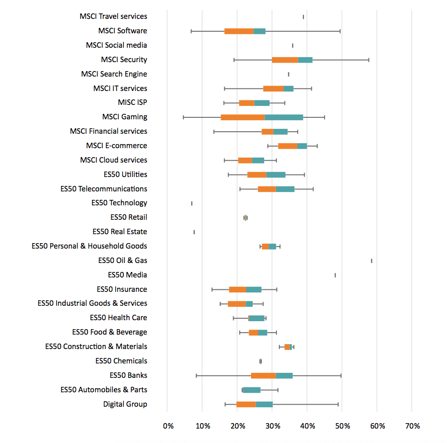 Figure 4: Distribution of effective corporate tax rates for EuroStoxx50 corporations and companies largely providing digital services, by industrial sector, 5y averages