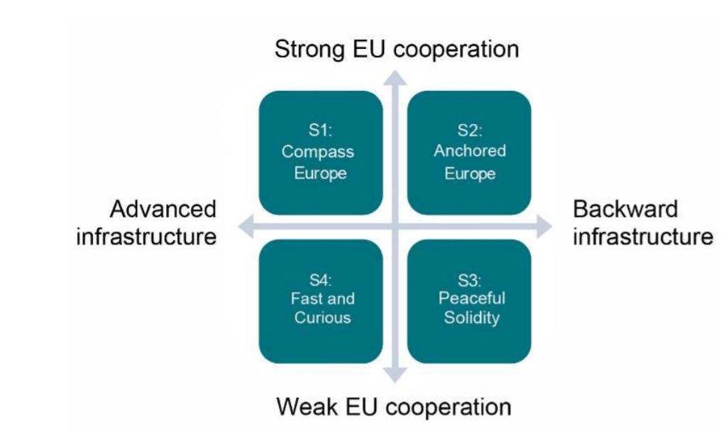 To bring all of it more into specific European context, the Foresight Centre at the Estonian Parliament created four scenarios in 2020 which relied on the insights expressed by national and international experts. By combing two key drivers – the nature of EU cooperation and infrastructure – the expert-led workshop generated four scenarios for understanding alternative future trajectories (Arenguseire Keskus, 2020; Kitsing, 2021).