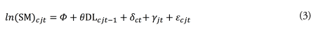 Equations (1) and (2) are used in our baseline regression which is specified in equation (3) below. Equation (3) measures the causal impact of the data linkage index in the previous year on the log of cross-border imports of services (SM). We regress the logarithm of services imports in country c, in services sector j, in time t, and on the data linkage index with a one-year lag. We use a lagged variable because, on a wider scale, it takes time before downstream firms across all countries feel the regulatory consequences of a change in the data policies. In addition, applying the lag takes out further endogeneity concerns to the extent that reverse causality becomes less obvious. The baseline specification takes the following form: