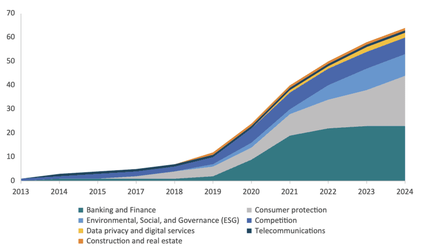 Figure 1: Cumulative number of collective action lawsuits across economic areas, Germany (2008–2024)
