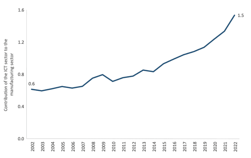 [5] Figure 5 measures the total direct and indirect input requirements from the ICT industry to produce one unit of final demand from the manufacturing industry.