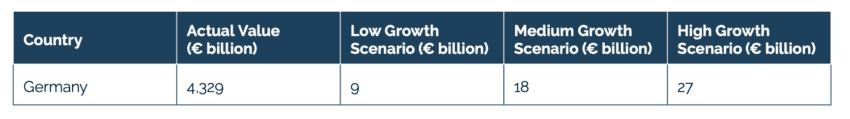The study sets out three scenarios (Low, Medium and High Growth). The scenarios assume that if collective actions in Germany continue to rise, the economic impact would be proportional to the effects identified in the US studies. Each scenario estimates the costs for the three variables identified earlier – private enforcement as a share of GDP, litigation costs and market capitalisation. These are independent exercises, and the results are not designed to be added together.