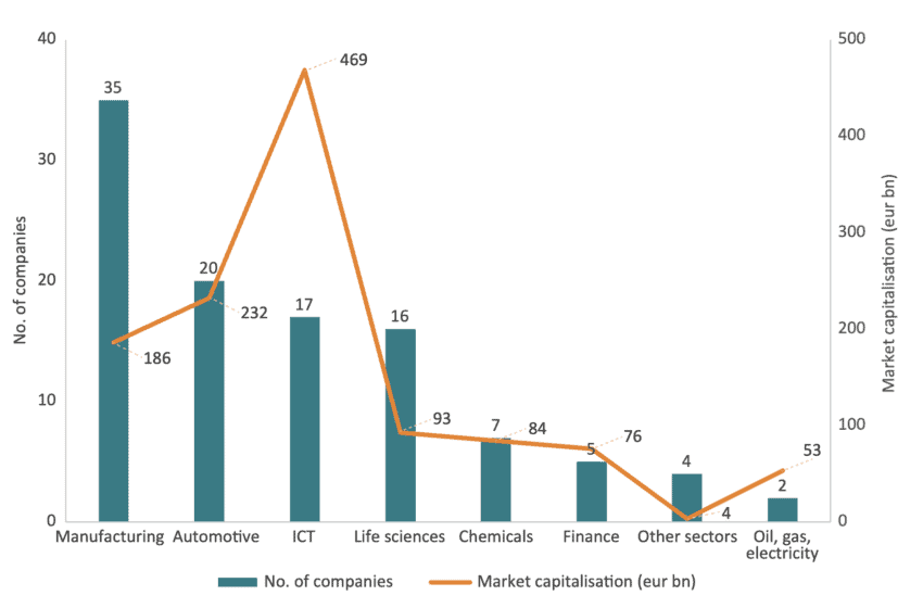 We classify the top 106 German R&D investors by economic sector. Data on market capitalisation comes from the EU Joint Research Centre’s annual report, which tracks the top 2,500 global R&D investors – widely regarded as the world’s most innovative firms.[10] Figure 6 shows the distribution of the 106 most innovative German companies by sector, together with their combined market capitalisation. Annex 2 provides a full list of the companies and their sectors. The importance of the ICT sector, highlighted in Chapter 5, is also clear here. Of the 106 most innovative German firms, 17 are in ICT, representing 39 percent of total market capitalisation.