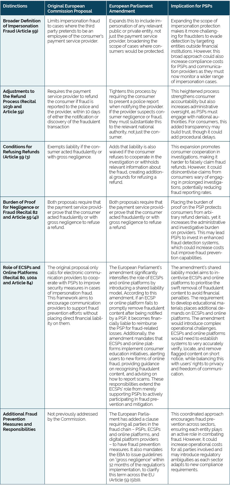 The European Commission’s original proposal for Article 59, prior to the amendments introduced by the European Parliament, aimed to clarify PSP liability in cases of impersonation fraud to enhance consumer protection.[1] This focused on PSPs’ responsibilities in refunding fraudulent financial transaction losses, given that PSPs oversee and control these transactions. The proposed amendment significantly broadens this scope by introducing shared liability across PSPs, ECSPs and online platforms.[2] The amendment proposes that ECSPs and platforms be financially liable if they fail to remove fraudulent content after notification from a PSP. This shifts responsibility to sectors outside the payment processing industry (see Table 1).
