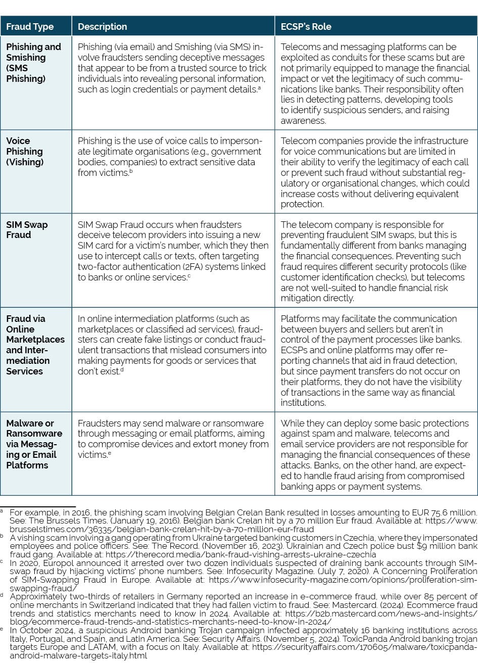 Fraudulent activities are increasingly sophisticated and adaptive, often exploiting communication channels in ways that are difficult to detect without specialised fraud prevention tools, expertise, and dedicated personnel.[8] In contrast to PSPs, ECSPs and online platforms face different types of fraud risks, such as phishing, smishing, and SIM swap fraud. These fraud tactics exploit communication channels but do not involve direct financial transactions. While ECSPs and platforms can play a supporting role by detecting patterns of fraudulent behaviour, they lack the specialised systems and capabilities required to manage fraud effectively, as they do not oversee, facilitate, or control financial transactions.