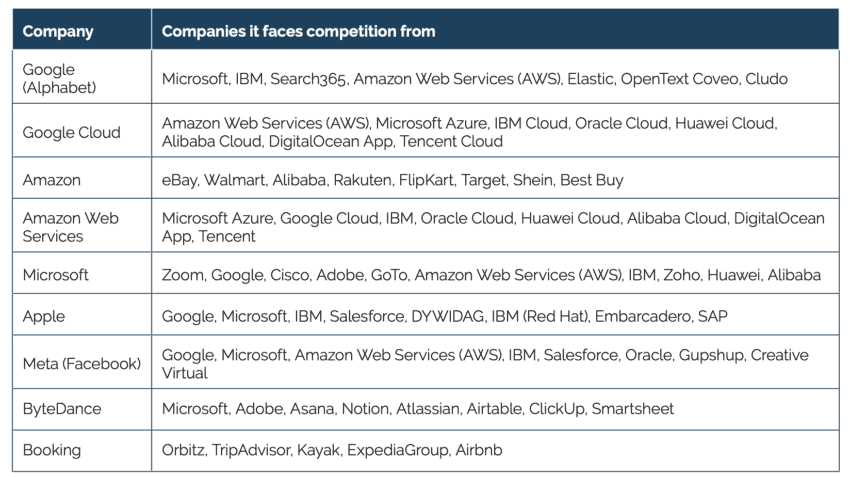 [10] Gartner. Google Alternatives. Available at: https://www.gartner.com/reviews/market/insight-engines/vendor/google?marketSeoName=insight-engines&vendorSeoName=google ; Gartner. Google Cloud Platform Alternatives. Available at: https://www.gartner.com/reviews/market/strategic-cloud-platform-services/vendor/google/product/google-cloud-platform/alternatives; AMZ Scout. Top Amazon Competitors You Need To Know About. Available at: https://amzscout.net/blog/amazon-competitors/; Gartner. Microsoft Alternatives: https://www.gartner.com/reviews/market/meeting-solutions/vendor/microsoft/alternatives; Gartner. Microsoft Azure Alternatives. Available at: https://www.gartner.com/reviews/market/strategic-cloud-platform-services/vendor/microsoft/product/azure/alternatives; Gartner. Apple Alternatives. Available at: https://www.gartner.com/reviews/market/application-development-integration-and-management-others/vendor/apple/alternatives; Gartner. Bytedance Alternatives. Available at: https://www.gartner.com/reviews/market/collaborative-work-management/vendor/bytedance/alternatives?marketSeoName=collaborative-work-management&vendorSeoName=bytedance ; Gartner. Facebook Alternatives. Available at: https://www.gartner.com/reviews/market/enterprise-conversational-ai-platforms/vendor/meta/alternatives; Craft. Bookings Alternatives. Available at: https://craft.co/bookingcom/competitors