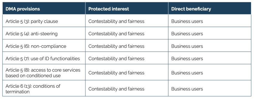 The DMA frequently invokes the concepts of “fairness” and “contestability” as central justifications for its provisions. However, these terms are often used interchangeably and without clear definitions, leading to potential overlaps and ambiguities in the regulation’s application. Table 1 illustrates how various DMA provisions cite both “fairness” and “contestability” as protected interests, yet without distinguishing between the two or clarifying their specific relevance to different stakeholders. This overlap highlights the lack of precision in the regulatory language, which could result in inconsistent enforcement and unintended consequences for market dynamics.