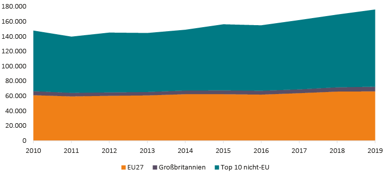 Abbildung 1: Europäische Patentanmeldungen 2010 bis 2019, EU27, Großbritannien und die 10 wichtigsten nicht-EU-Länder