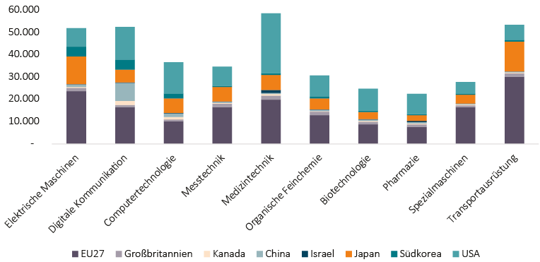 Quelle: Europäisches Patentamt. Hinweis: Elektrische Maschinen umfassen elektrische Maschinen, Apparate und Energie. Die Analyse basiert auf den bekanntgemachten von der EPA erteilten Patenten.