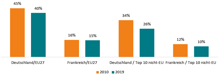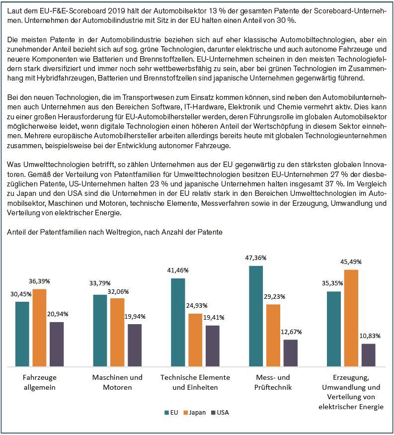 Im Bereich der globalen Innovationen zeichnen sich bereits heute ähnliche Entwicklungen ab. Im Jahr 2019 gingen beim Europäischen Patentamt (EPA) etwa 181.000 Patentanträge ein, ein neuer Rekord, um 4 % mehr als 2018. Insgesamt kam fast die Hälfte aller Patentanmeldungen von Unternehmen (und Forschungseinrichtungen) mit Sitz in Europa (inkl. nicht-EU-Ländern wie der Schweiz). US-Unternehmen reichten ein Viertel aller EPA-Anmeldungen ein, gefolgt von Unternehmen aus Japan, China und Südkorea. Die EPA-Zahlen zeigen, dass Europa für Unternehmen aus anderen Regionen nach wie vor eine attraktive Wirtschaftsregion ist. Die Zahlen zeigen aber auch, dass die Innovationsfähigkeit von Unternehmen aus EU-Ländern in Relation zurückgeht.