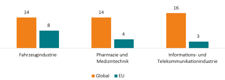 Zwischen 2010 und 2019 nahmen die Forschungs- und Patentierungsaktivitäten außereuropäischer Unternehmen stärker zu als die von europäischen Unternehmen (siehe Abbildung 1). Auch für die zehn wichtigsten Technologiesektoren in Bezug auf Patente zeigen die EPA-Zahlen, dass die Innovationsbilanz europäischer Unternehmen eher gemischt ist. Zwischen 2010 und 2019 wiesen Unternehmen mit Sitz in der EU relativ hohe Patentierungsaktivitäten in der Automobil-, Chemie- und Maschinenbauindustrie auf. Deutlich weniger aktiv waren Unternehmen mit Sitz in der EU in den Bereichen digitale Kommunikation und Computertechnologien sowie Pharmazeutika und Biotechnologie (siehe Abbildung 2). Wie in Tabelle 7 im Anhang dargestellt, sind Unternehmen mit Sitz in den USA in sieben der zehn wichtigsten Technologiebereiche führend. Deutsche Unternehmen zählen nach wie vor zu den führenden Innovatoren in den Bereichen Medizintechnik, Pharmazeutika, elektrische Maschinen, Spezialmaschinen, Chemie sowie Transporttechnik und in der Automobilindustrie.