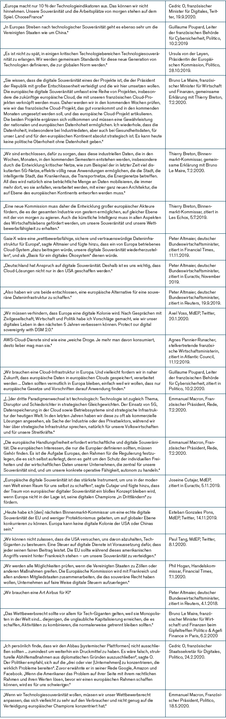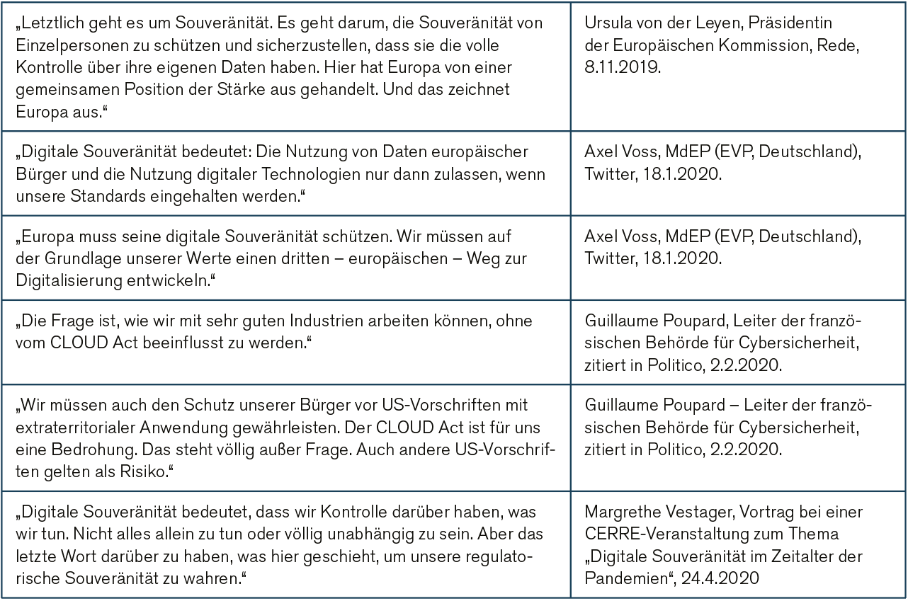 Auch in ihren übergeordneten politischen Leitlinien für die neue Europäische Kommission stellte Ursula von der Leyen fest, dass „[i]n diesem Bereich [Schutz der Souveränität des Einzelnen und Gewährleistung der vollen Kontrolle über die eigenen Daten] Europa von einer Position gemeinsamer Stärke aus gehandelt hat. Und das zeichnet Europa aus.“ Unter Bezugnahme auf eine der wichtigsten politischen Errungenschaften der Juncker-Kommission, die Annahme einer noch immer nicht vollständig harmonisierten EU-Datenschutzverordnung, forderte die neue Kommissionspräsidentin die Bereitschaft der Europäer, „unseren europäischen Weg weiterzugehen, den Datenfluss und die breite Nutzung von Daten abzuwägen und gleichzeitig hohe Vertraulichkeit, Sicherheit und ethische Standards zu erhalten. Wir haben dies mit der Datenschutz-Grundverordnung (DSGVO) bereits erreicht und viele Länder sind unserem Beispiel gefolgt“ (von der Leyen 2019d). In der Debatte über eine europäische Technologiesouveränität hörte man ähnliche Aussagen von Politikern aus den Mitgliedstaaten und dem Europäischen Parlament (siehe Tabelle 1).